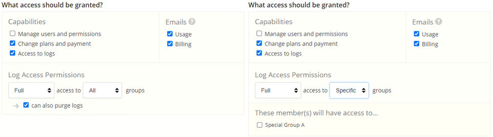- Billing, purging, and all logs/alerts roles are given change plans and payment access, as well as full access to logs in all groups and the ability to purge logs.