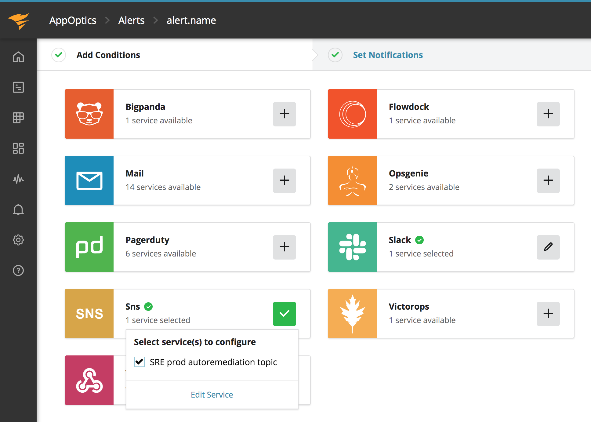 Amazon Simple Notification Service (SNS) makes it possible to coordinate and manage the delivery of messages to endpoints. SNS is frequently used to route notifications from your applications or services, through user-defined "topics", and eventually to one or more supported endpoints such as HTTP, Email, SMS, or even other supported Amazon Web Services. AppOptics supports SNS as a service notification type, allowing you to craft custom delivery pipelines for your AppOptics alert notifications. Alerts sent via the SNS service integration include a JSON payload that can be deconstructed and consumed programmatically.