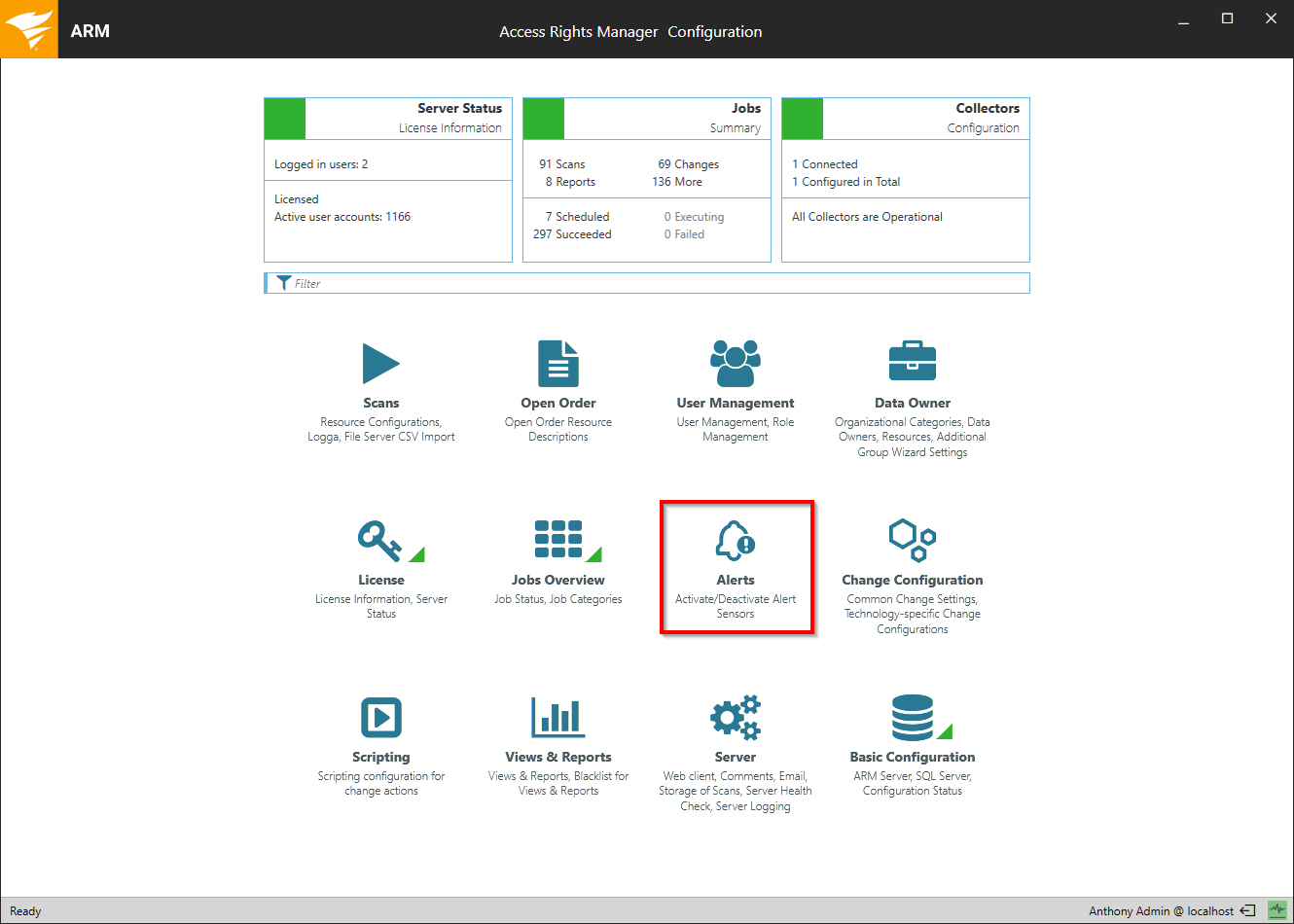 You can activate and deactivate the alarm sensors by clicking Alerts in the Configuration application.