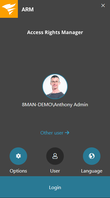 By default, the Access Rights Manager application logs in to the local ARM Server you set up during the installation. You can use the advanced options to log in to a different ARM Server, change the server port, or change the language.