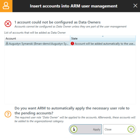 Data Owners must have a Change or Read user role in Access Rights Manager user management. If you need to assign data owners who do not have the required role, the following window displays on your screen. When you click Apply, the change role is assigned to the user. You can change the role at a later date in Access Rights Manager user management.