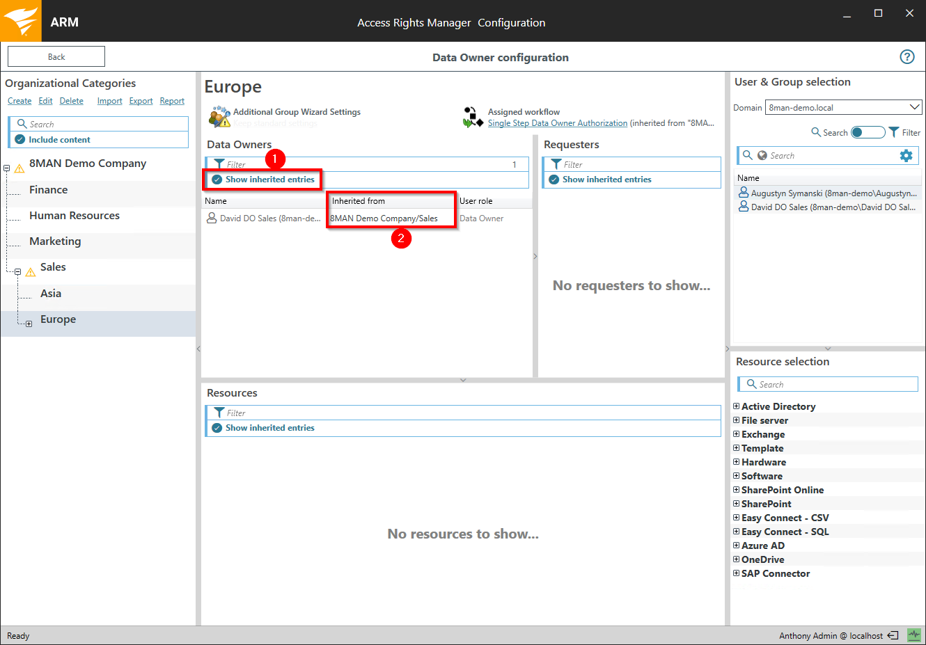 As a hierarchy rule, data owners can manage their assigned organizational category and sub-categories. When you activate the Show inherited entries option, the Inherited from column displays the inherited entry.