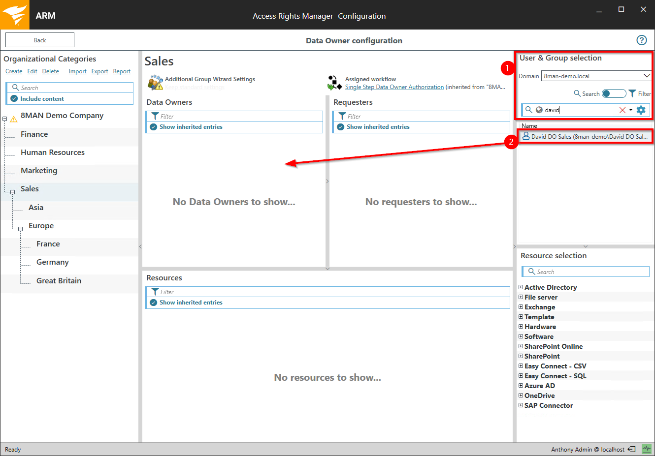 In the User & Group selection box, use the search and filter options to locate specific users and groups. After you locate a user or group, drag the name or group under Name to the Data Owners box.