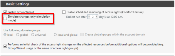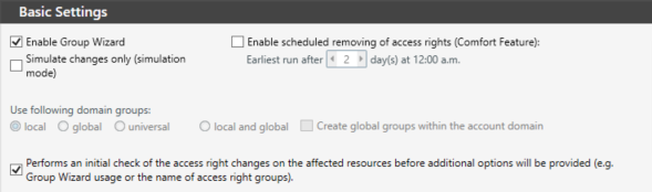 When you deselect the checkbox, before determining the required changes, a dialog box will open that allows you to make changes to the Group Wizard options. This can save a lot of time, especially if you want to perform complex access rights changes with non-standard Group Wizard options.