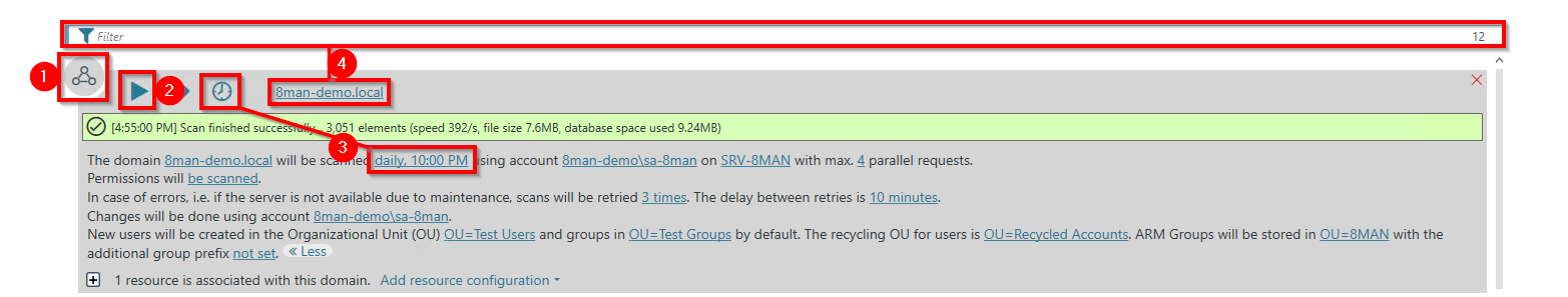 Starts and stops the AD scan. During and after a scan the light green box indicates the progress and success of the scan. All scans are saved for 14 days. Click the Jobs Overview tile on the Configuration homepage to review all scan results. |