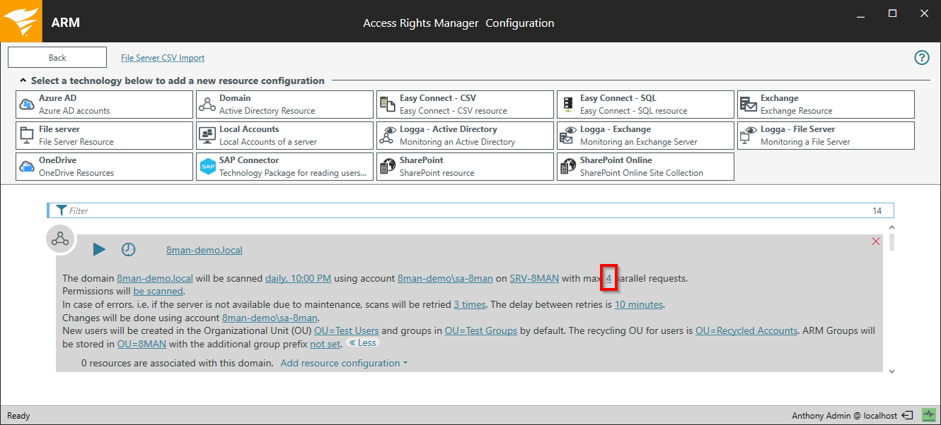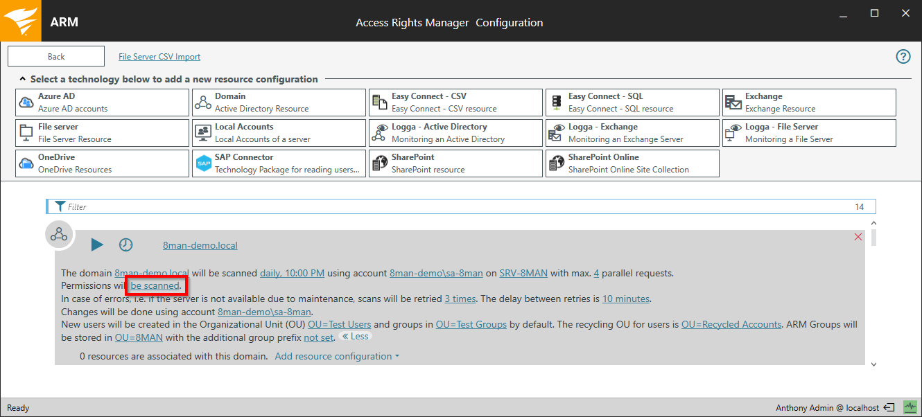 The AD resource configuration includes several controls you can use to configure, schedule, and start your Active Directory (AD) scan.