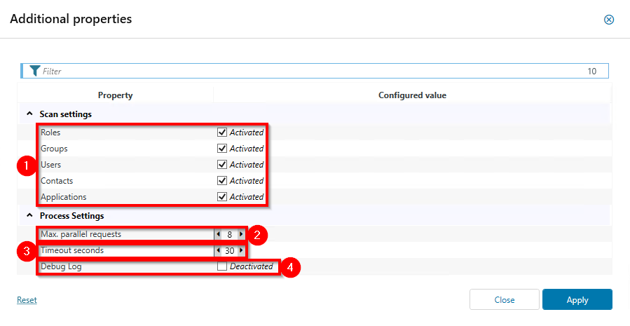 In the Additional properties window, configure the scan and process settings.   -