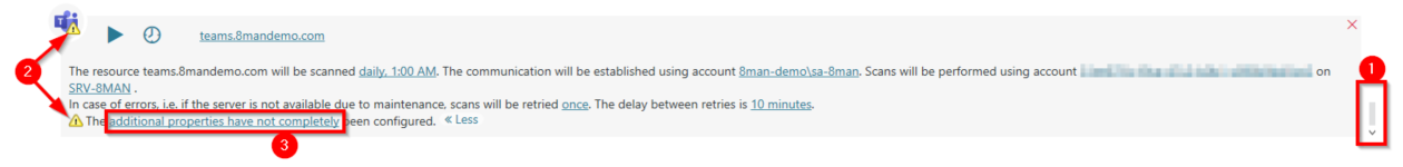Locate the Teams  scan configuration. You can use the scroll tool (1) to scroll and locate the configuration. scan configuration. You can use the scroll tool (1) to scroll and locate the configuration.  The  symbol (2) appended to the Teams symbol (2) appended to the Teams icon indicates that the additional properties are not configured. This is the initial state after adding a team scan configuration. You must open the properties once to perform a scan. icon indicates that the additional properties are not configured. This is the initial state after adding a team scan configuration. You must open the properties once to perform a scan.