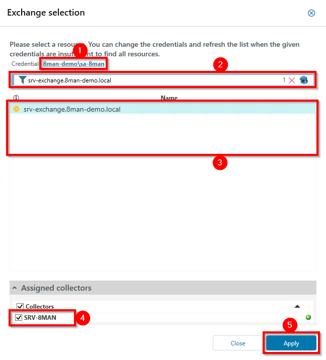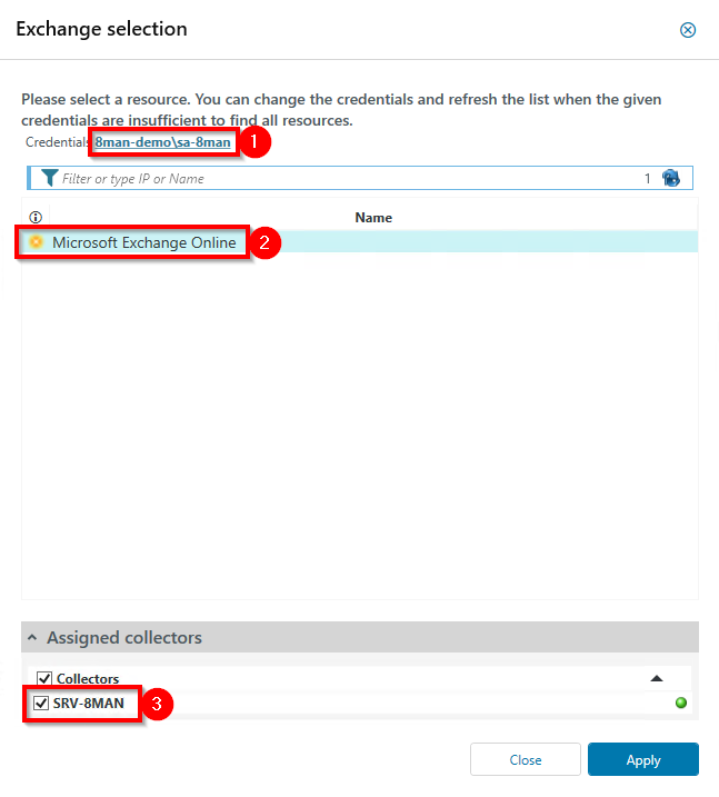 In the Exchange selection window, configure the resource and assigned collector.