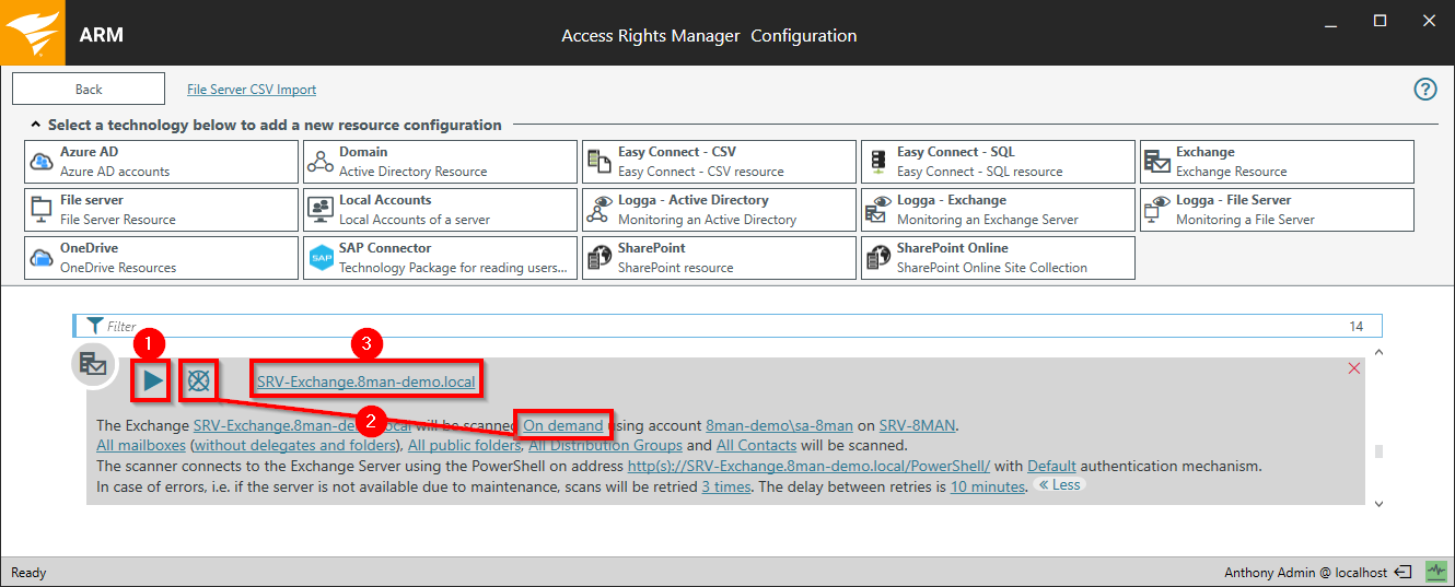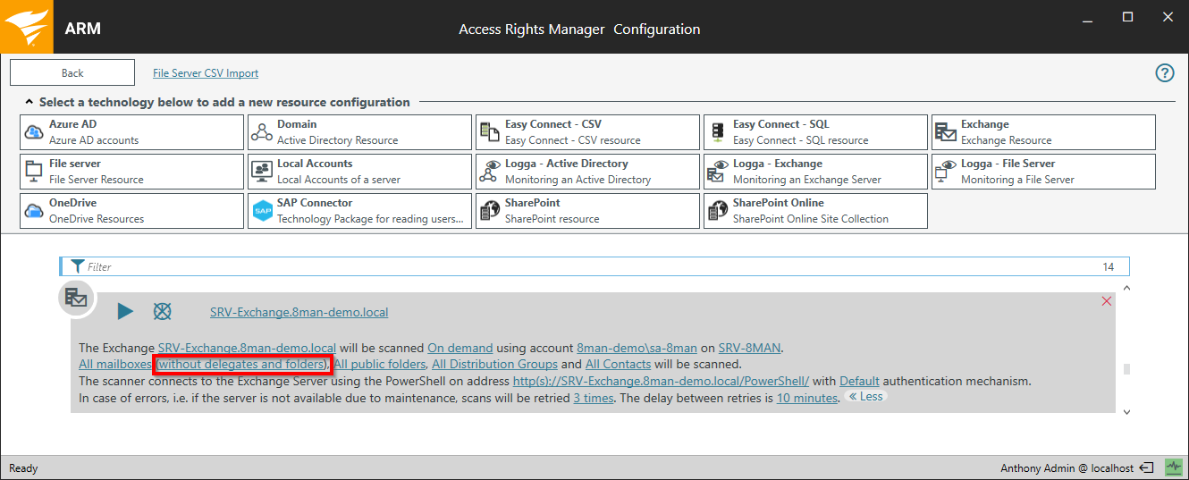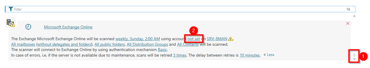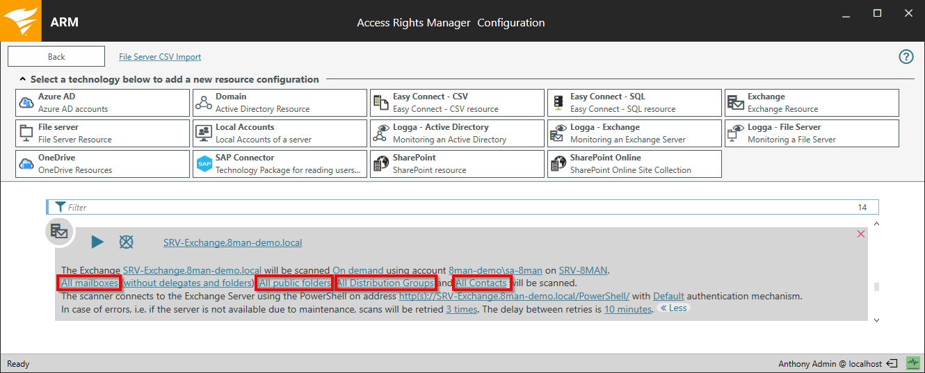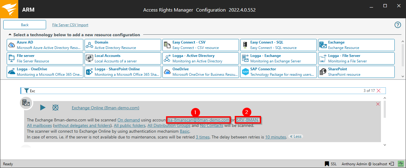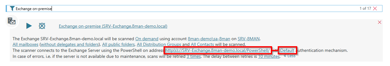 In the summary window, click one of the links highlighted below to configure the connections settings for the Exchange on-premise scan.