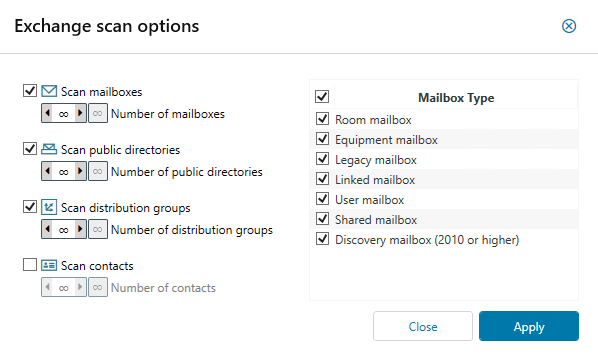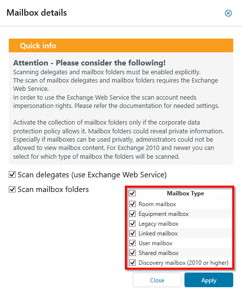 The mailbox type selection is independent for scans with PowerShell and EWS. You can determine which mailbox types are scanned and for which mailbox types the mailbox folders are scanned.
