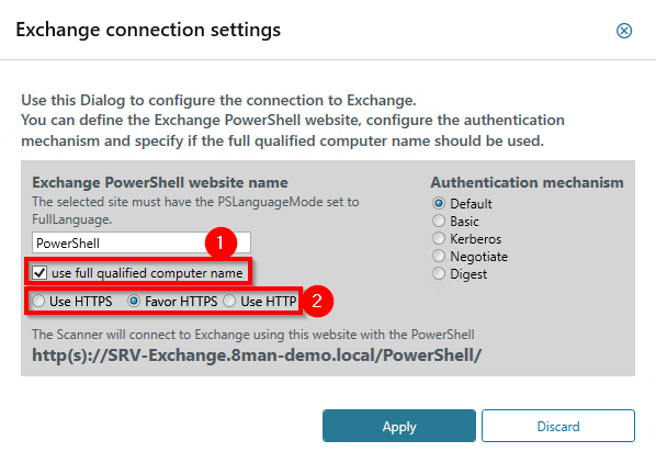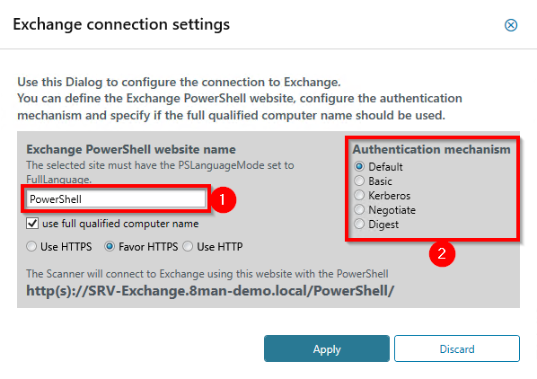 Connection settings for Exchange on-premise