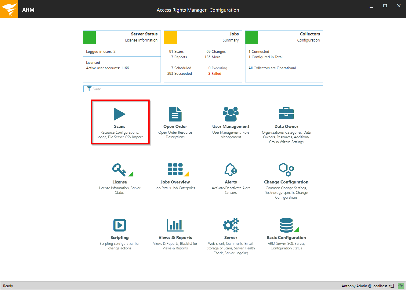 The scan results are stored in an SQL database. Using the ARM Configuration application, you can access the results to troubleshoot and resolve access issues in your organization. Events that occur between scans are captured by the Logga (monitoring) features.