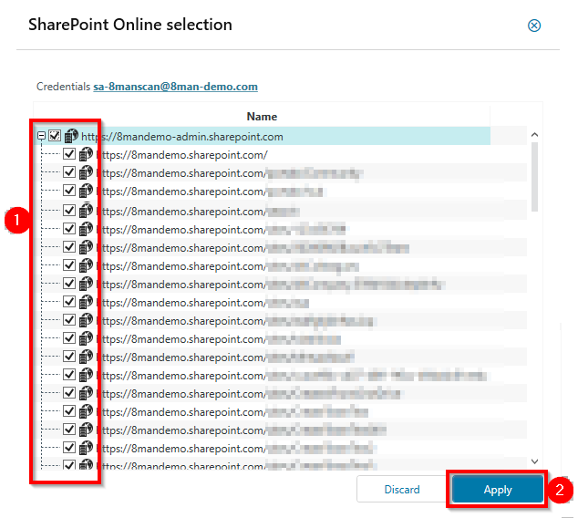 You can enter the Share Point Online "Admin URL". SolarWinds strongly recommends this method. For compatibility reasons it is also possible to enter the Website Collection URL, but then a scan configuration must be created for each Website Collection.
