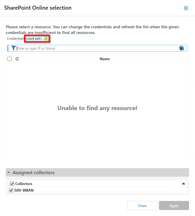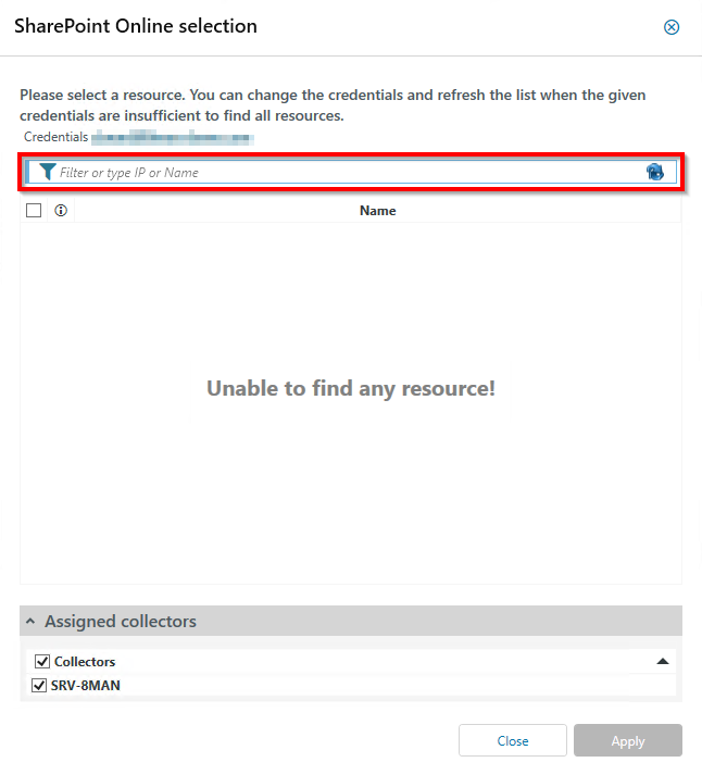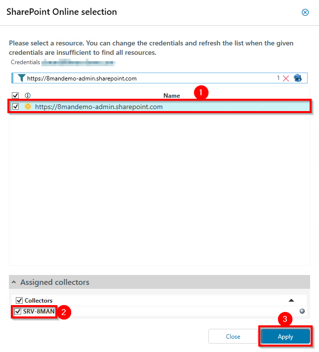 In the SharePoint Online Selection dialog box, select the resource and assigned collector.