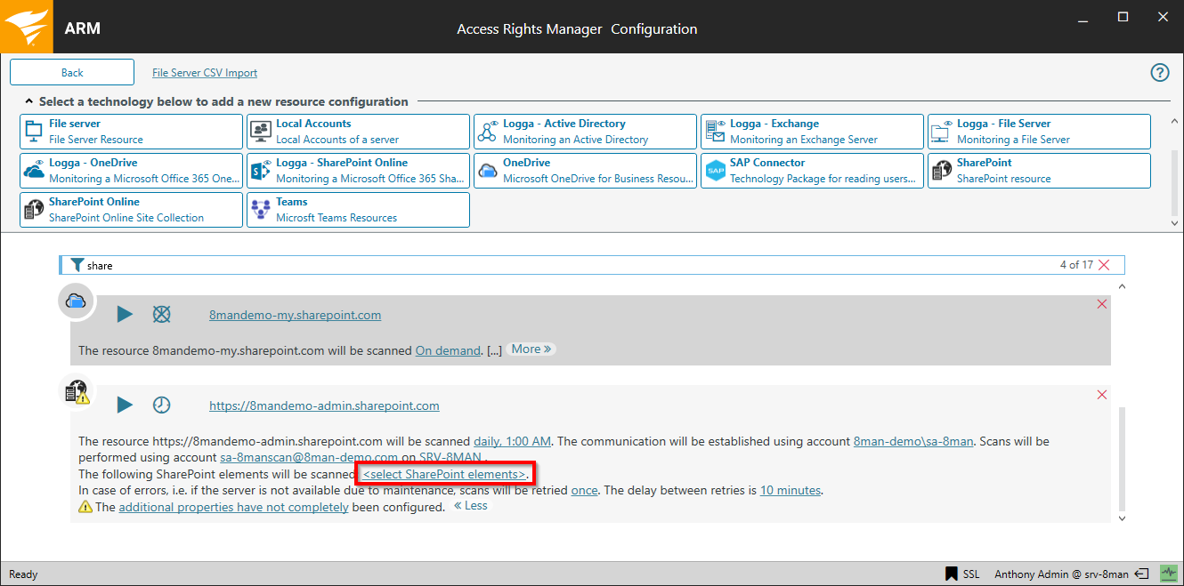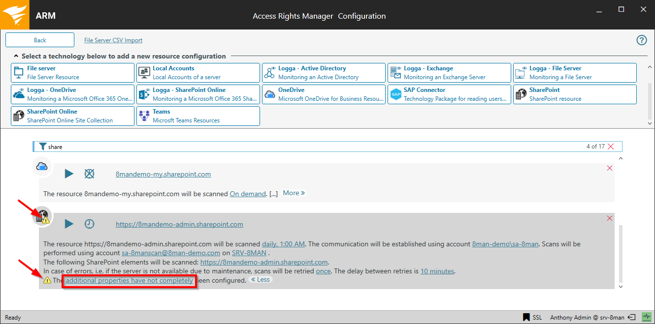 The SharePoint Online scan configuration is completed. The warning symbols indicate that the additional options need to be set. This procedure is identical a SharePoint Online and SharePoint on-premise configuration.