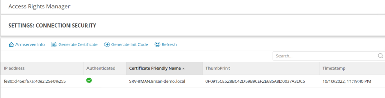 The Connection Security dashboard lists various clients who submitted a connection request to the ARM server. The dashboard also displays the client certificate details, including the thumbprint and certificate name.