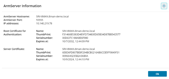 When you click Armserver info in the toolbar, the ArmServer Information window is displayed with information about the ARM server and the server certificate details.