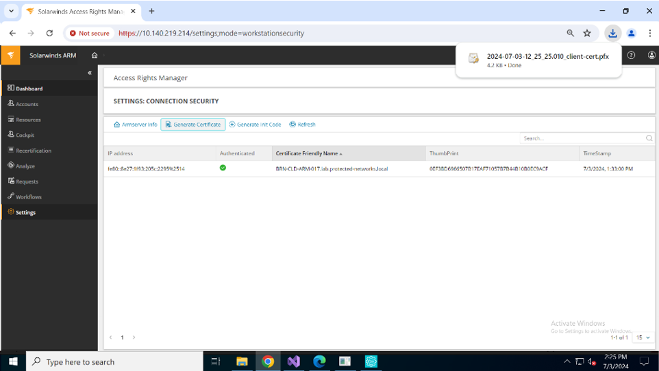 When an administrator clicks Generate Certificate in the toolbar, ARM generates the client certificate. This certificate is used to establish the connection between the ARM server and the client (Collector and Rich Client). You can download the generated certificate from the download directory in the web client machine. The certificate can be added to isolated client machines.