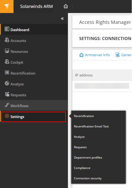 In the toolbar, locate Settings.   If Settings is not available, verify that you are logged in as an ARM administrator. If Settings is available, click Settings > Connection security to access the Connection Security dashboard.