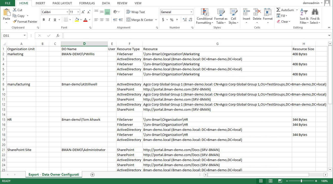 In your generated report, the last column contains information on data storage of file server resources. The Users column contains values only if your groups are configured as data owners.