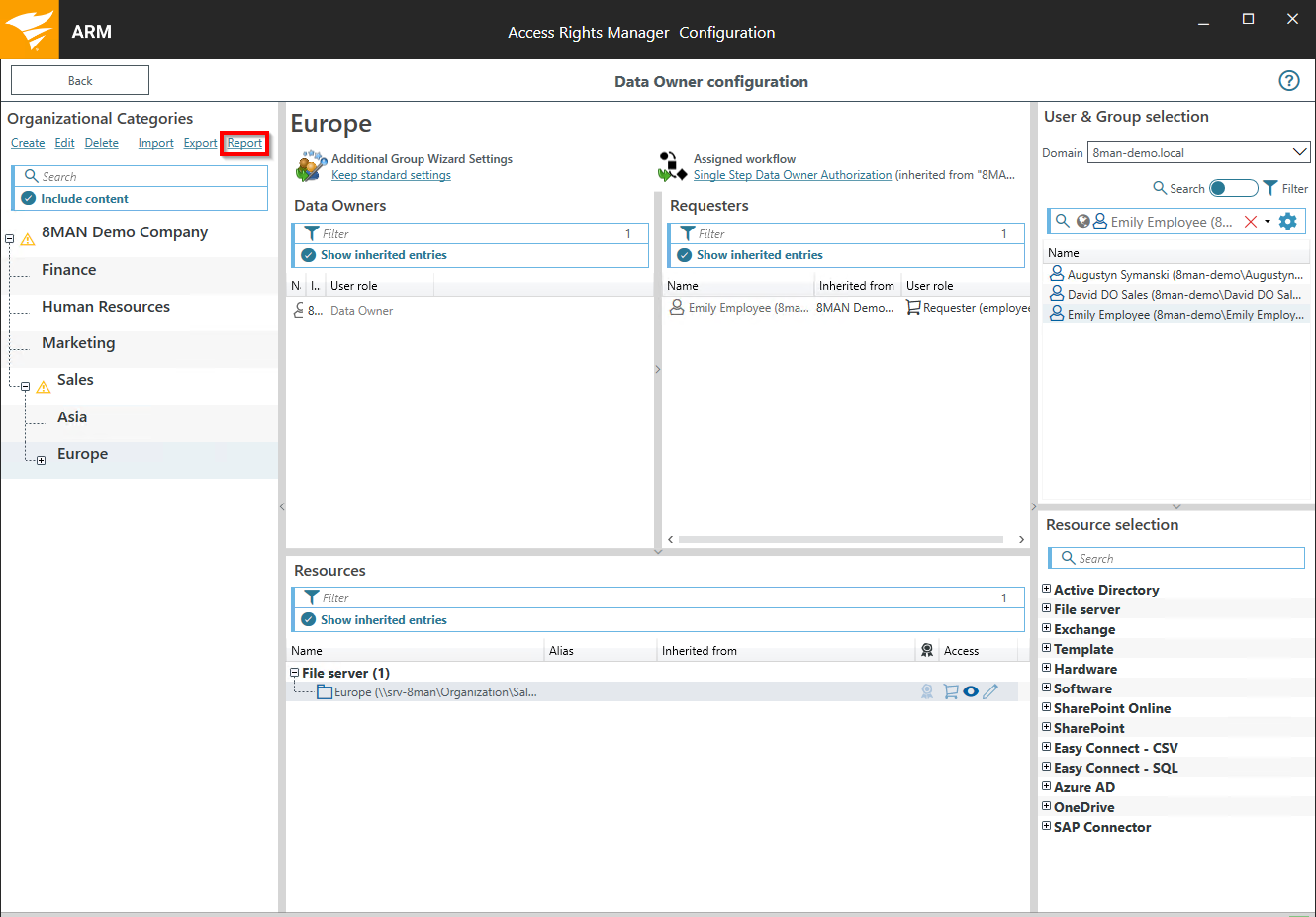 You can create a Data Owner configuration report in CSV format. In the Organization Categories box, click Report to generate the report.