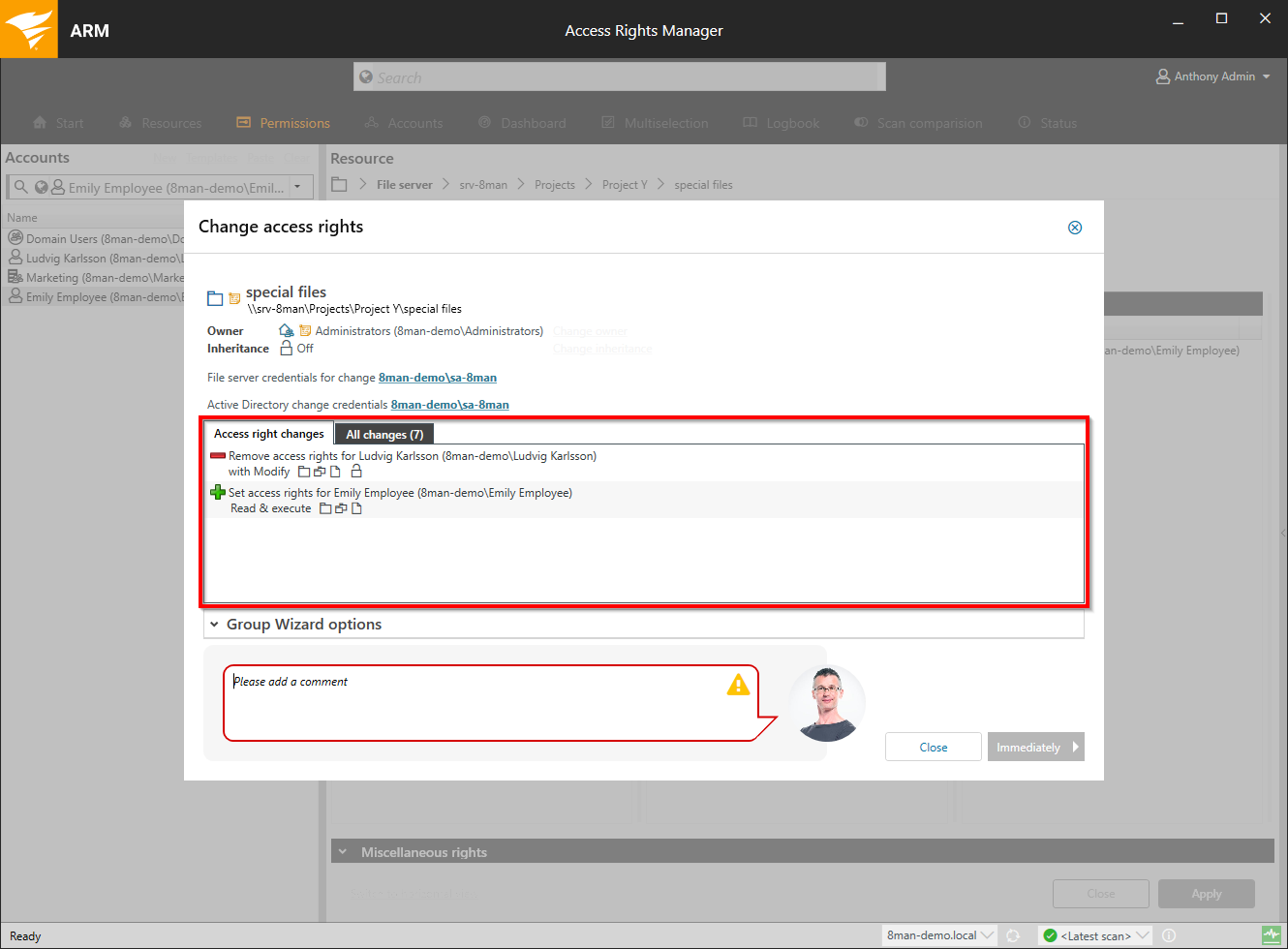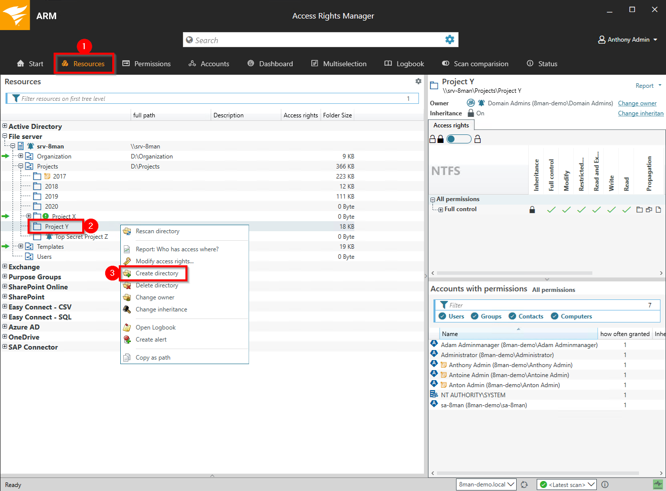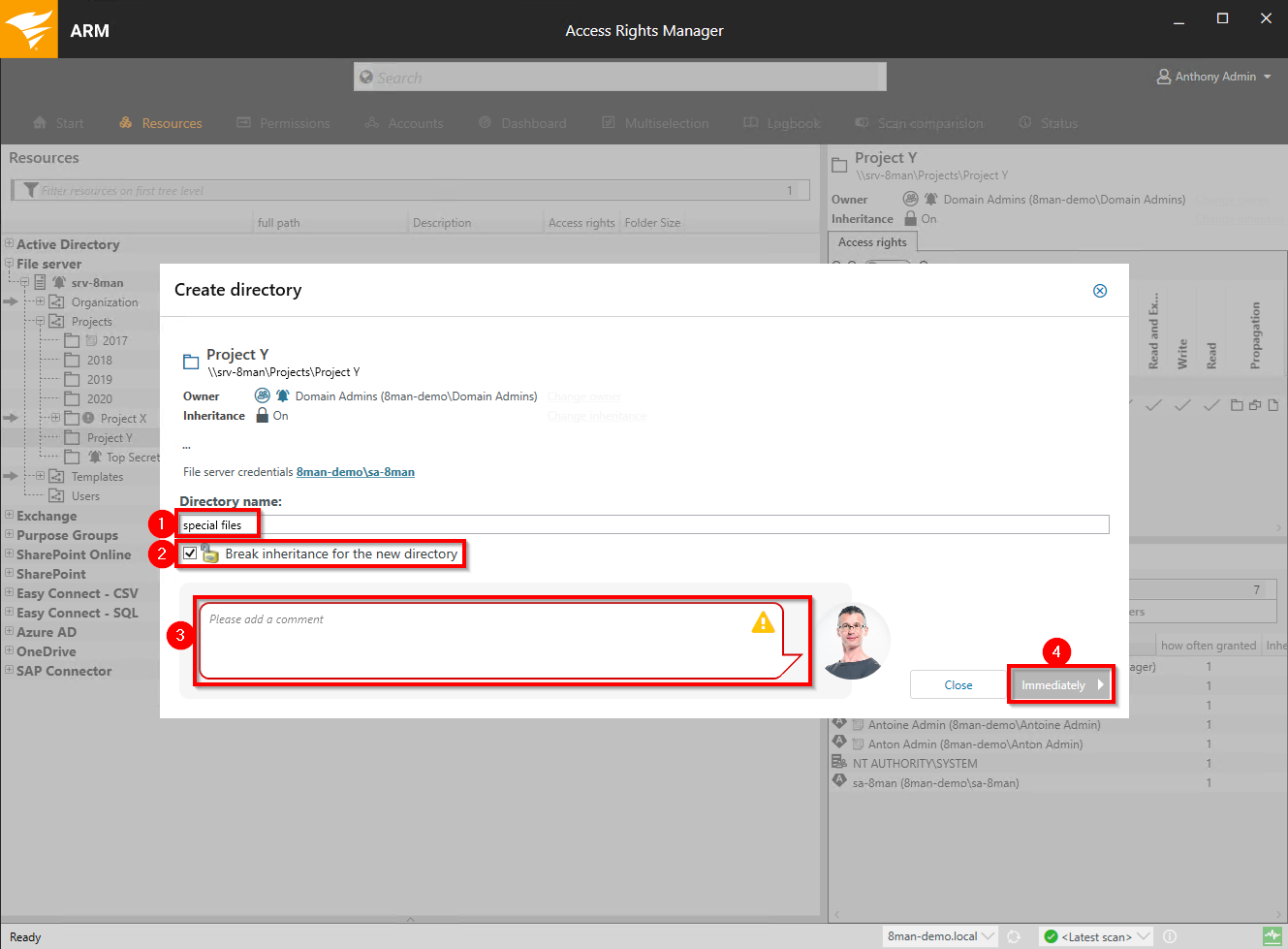 Managers and team leads can use Access Rights Manager to quickly and easily create protected file server directories. This is done by creating a directory, removing all inherited rights and then adding new access rights. The result is a protected directory that only selected users have access to.