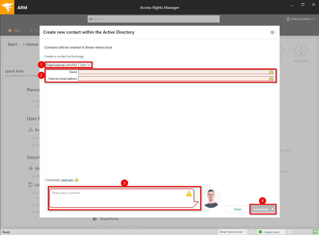 ARM provides a sample template for the creation of contacts. You must customize this template before you can use it. See Customize Access Rights Manager templates.