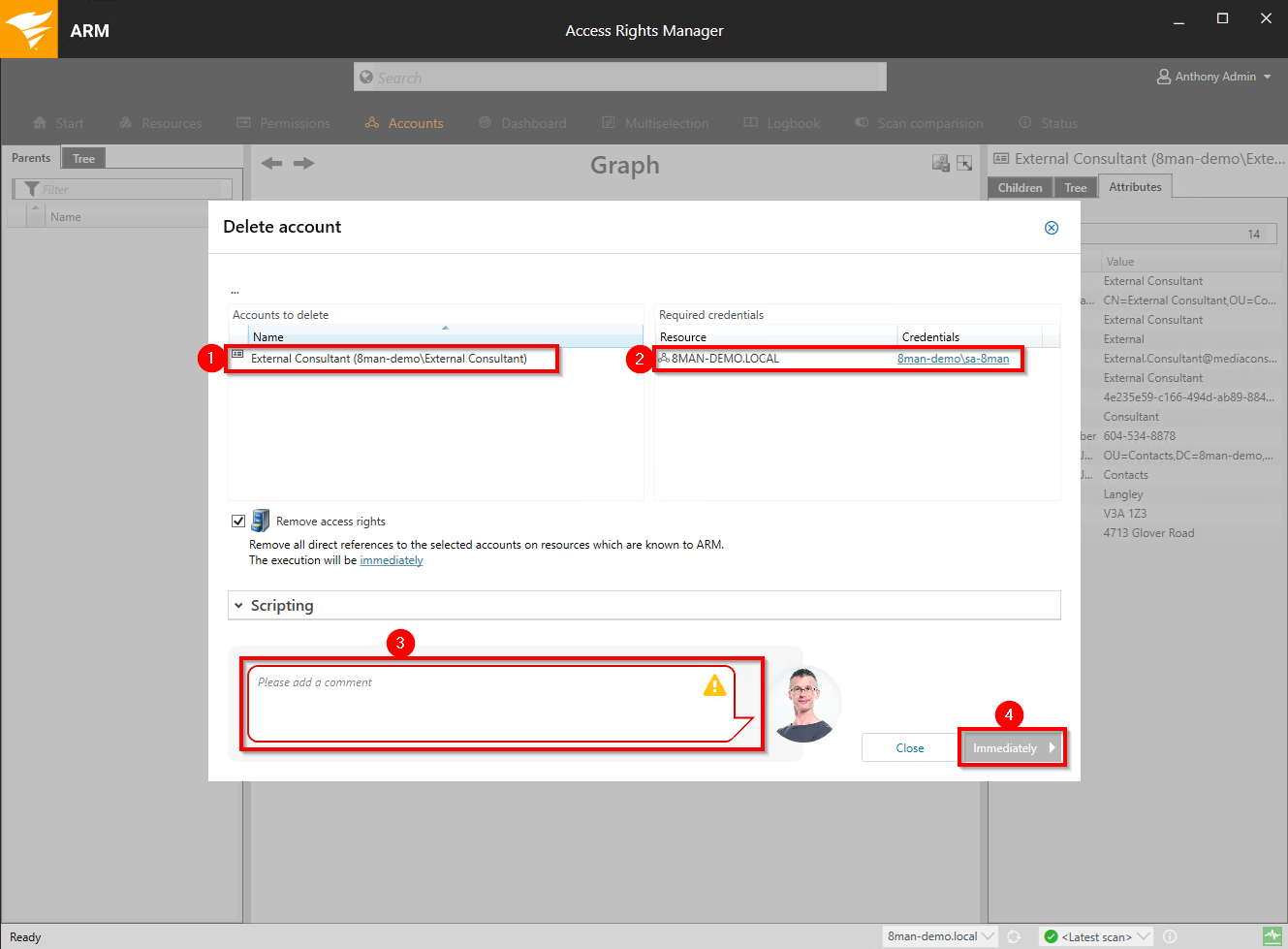 - ARM displays the credentials used to delete the contact. Specify other credentials if necessary.