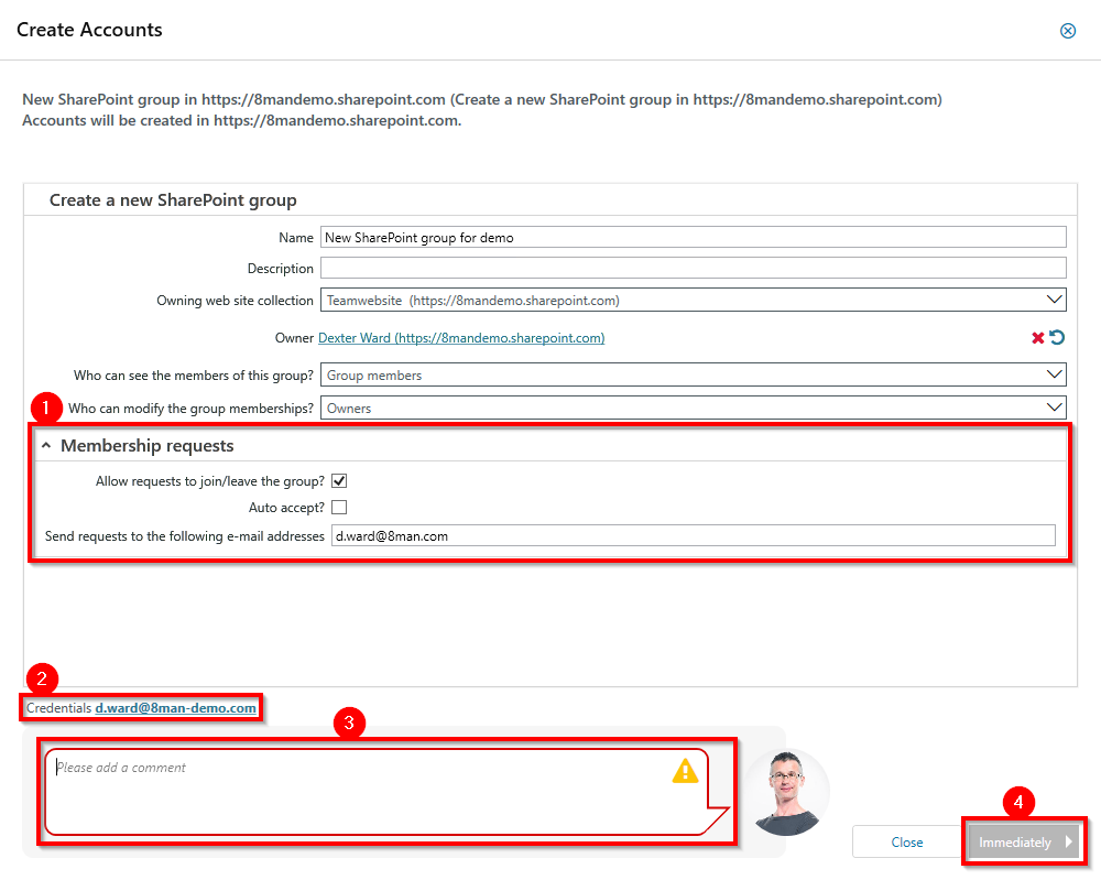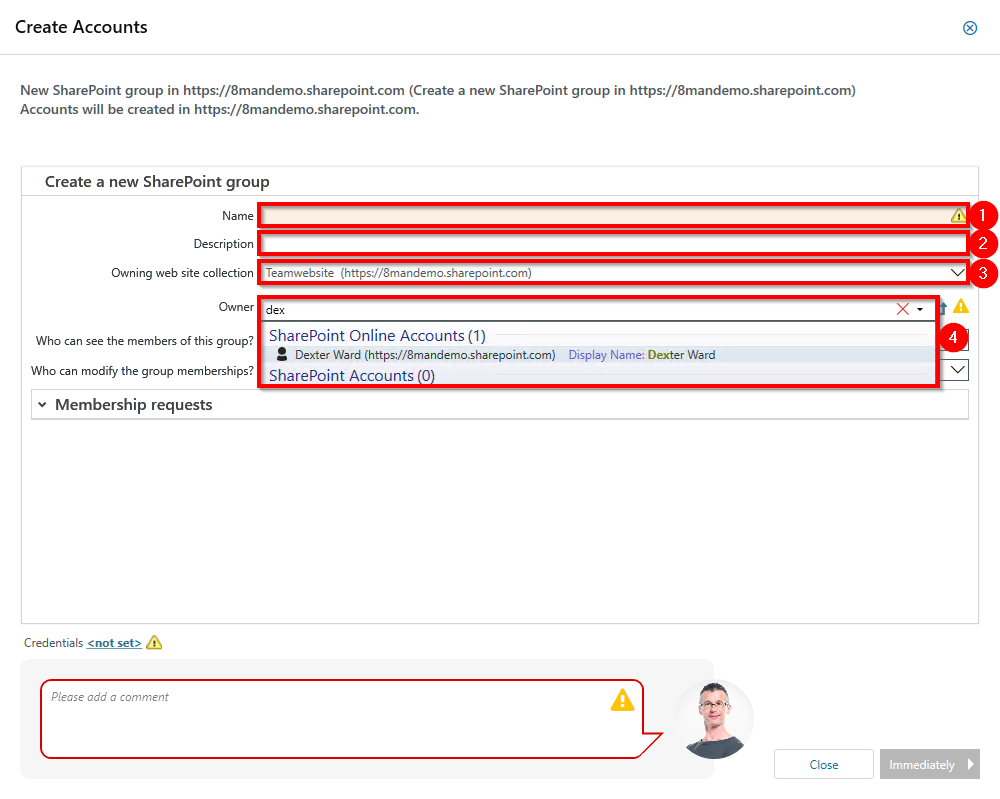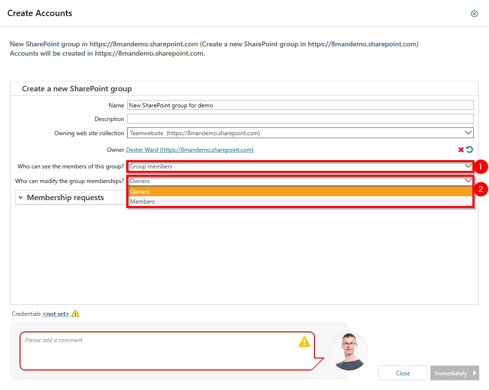 - Specify credentials that have the permissions to create the new group on SharePoint.
