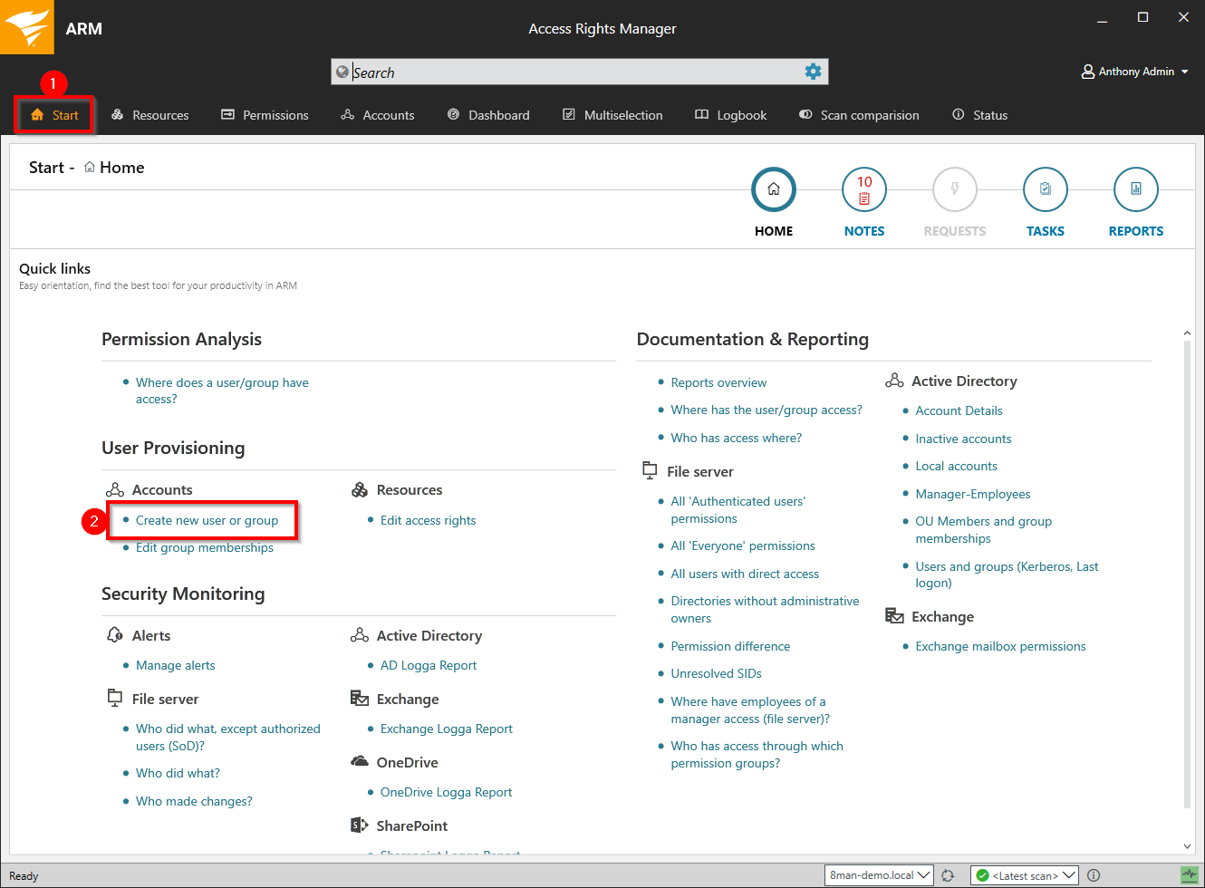 Select Create a new user account or group on the start page.