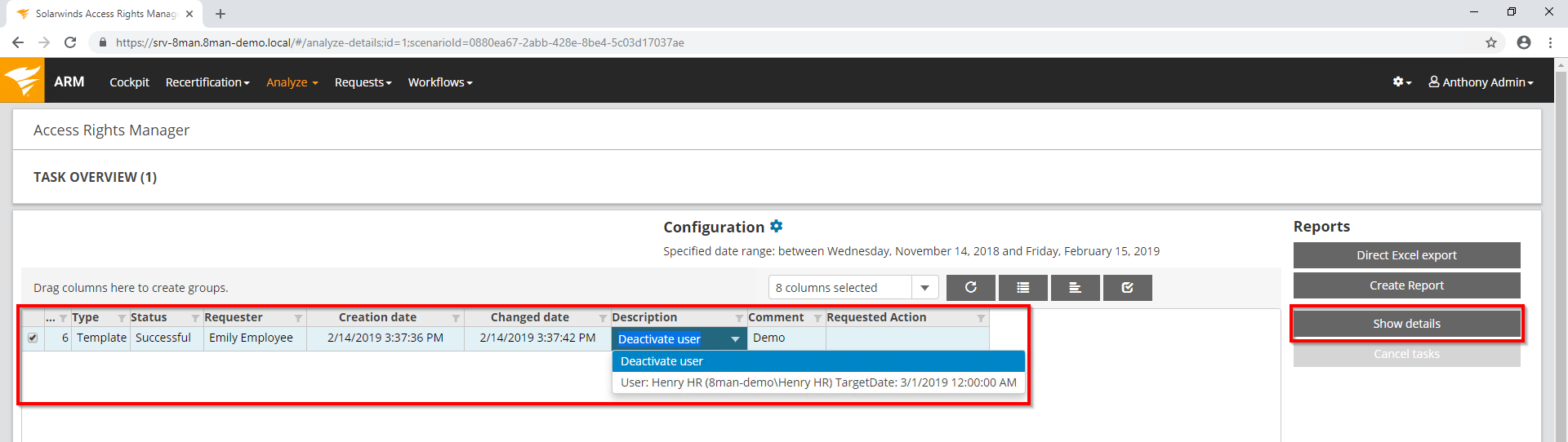 Ordering a new user on the GrantMA Self-Service Portal is natively supported by ARM. After the order workflow is completed, you can use a script to disable a user. The combination GrantMA - Scripts - ARM webAPI provides additional options to automate documented processes.