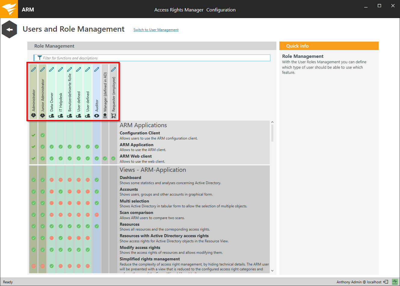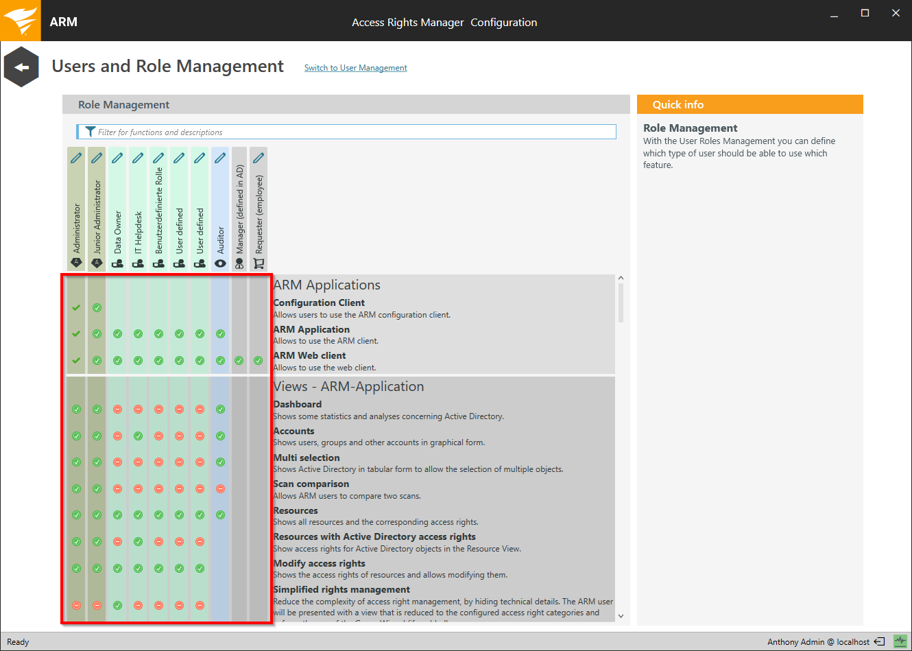 Use the check box matrix to determine which role can use specific views and functions. Unlicensed views and features are grayed out (legacy 8MAN licensing model only).