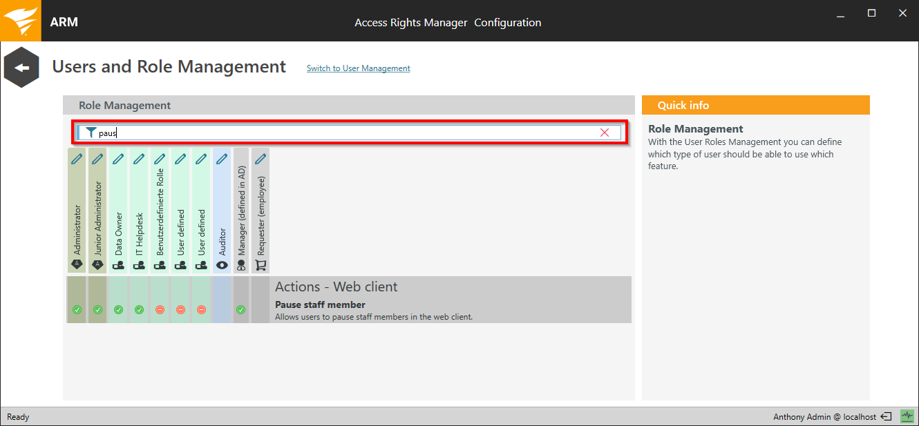 Enter a term in the search field to filter and locate a role based on action.