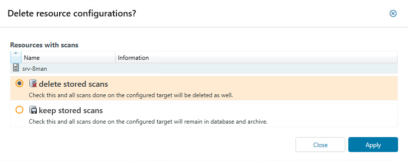 Select a resource configuration option. When you delete an FS configuration, you can keep or delete the scan data. You can delete a configuration if all other user interfaces are closed. The License Information and Server Status window displays all logged in users under Server Status.