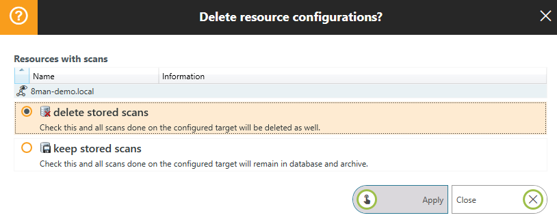 Select Delete stored scans to delete the scan, and then click Apply. All scans on the configured target will be deleted as well.
