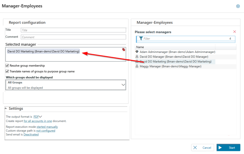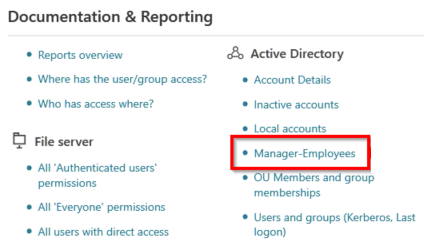 The Manager-Employees report provides data owners with some knowledge of Active Directory to view attributes and group memberships of their employees.