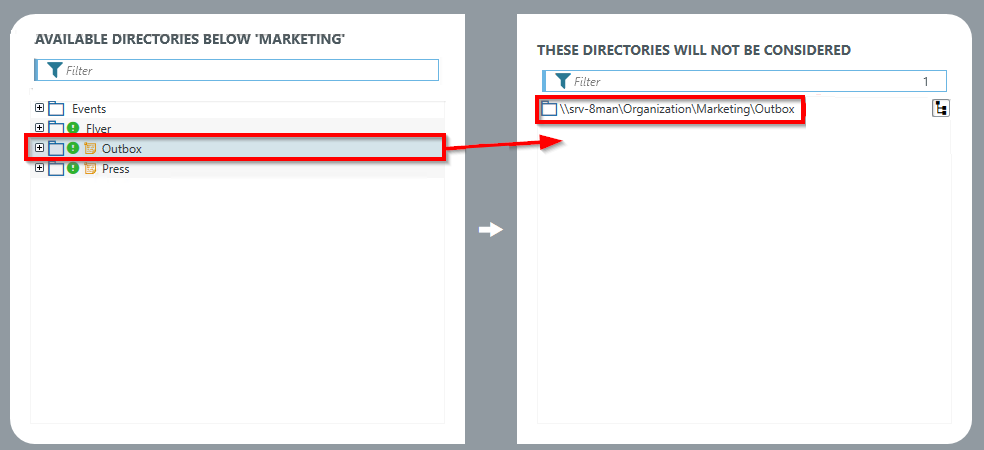 Use the filter function to find the target directories. When you filter, the tree view changes to a result list of the directory paths.