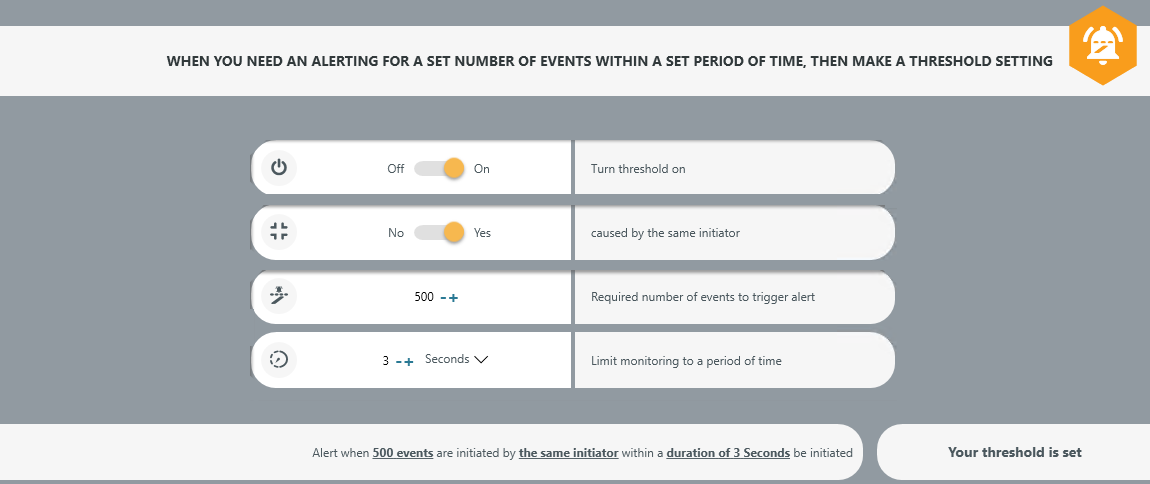 Defining a threshold with a large number of events over a long period of time will consume a lot of memory (RAM). SolarWinds recommends configure time intervals as small as possible.Your selections display at the bottom of the Threshold window. Your threshold is set.