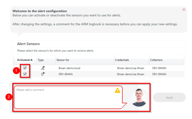 In the Alerts Configuration window, enable or disable the targeted alert sensors.