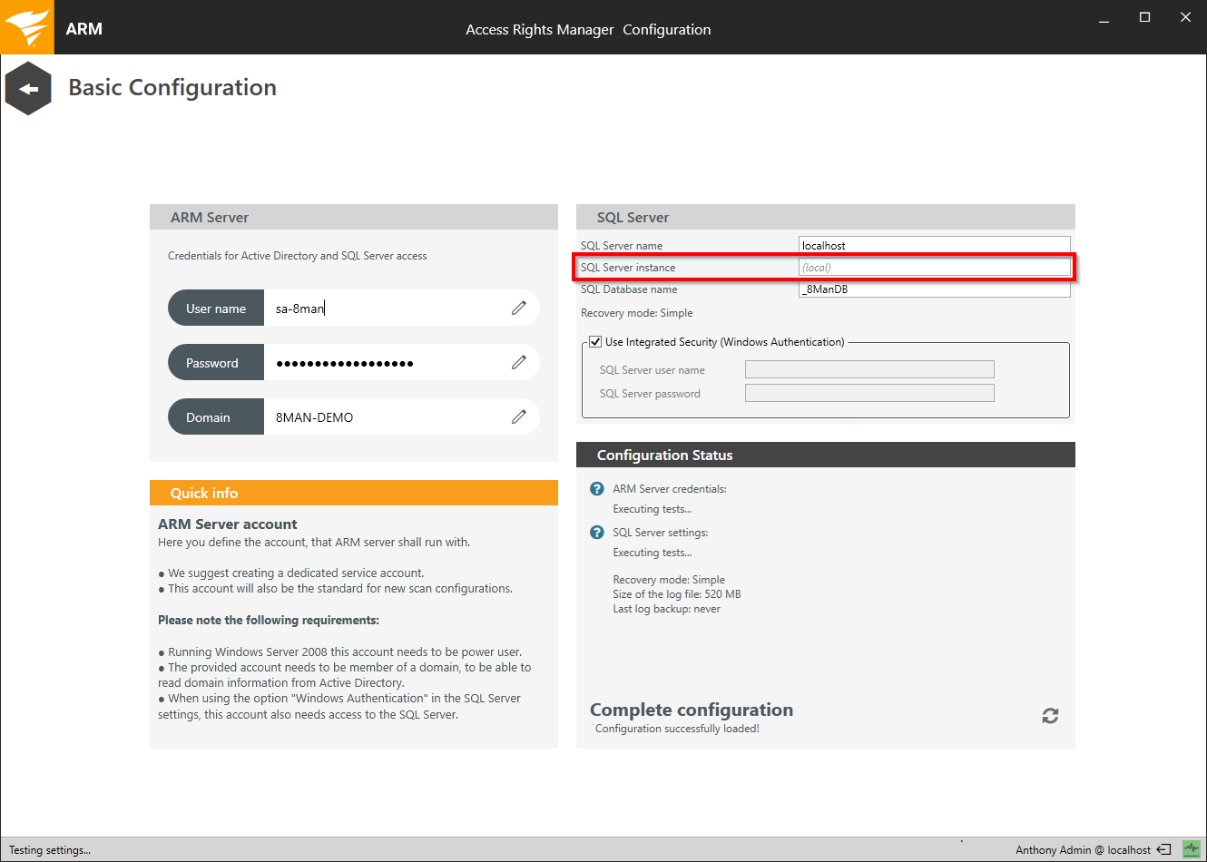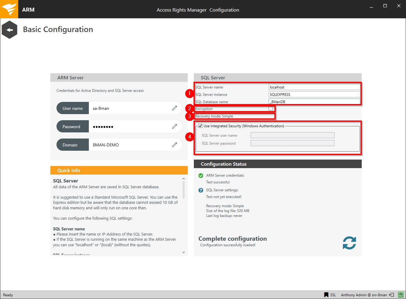 Select the type of log in method to SQL Server. If you select the Use Integrated Security (Windows Authentication) checkbox, Windows authentication is used with the Access Rights Manager server credentials (as explained under Quick info in the left column). If you do not select the Use Integrated Security (Windows Authentication) checkbox, SQL Server authentication is used. Enter the SQL Server user name and password to log in to SQL Server.