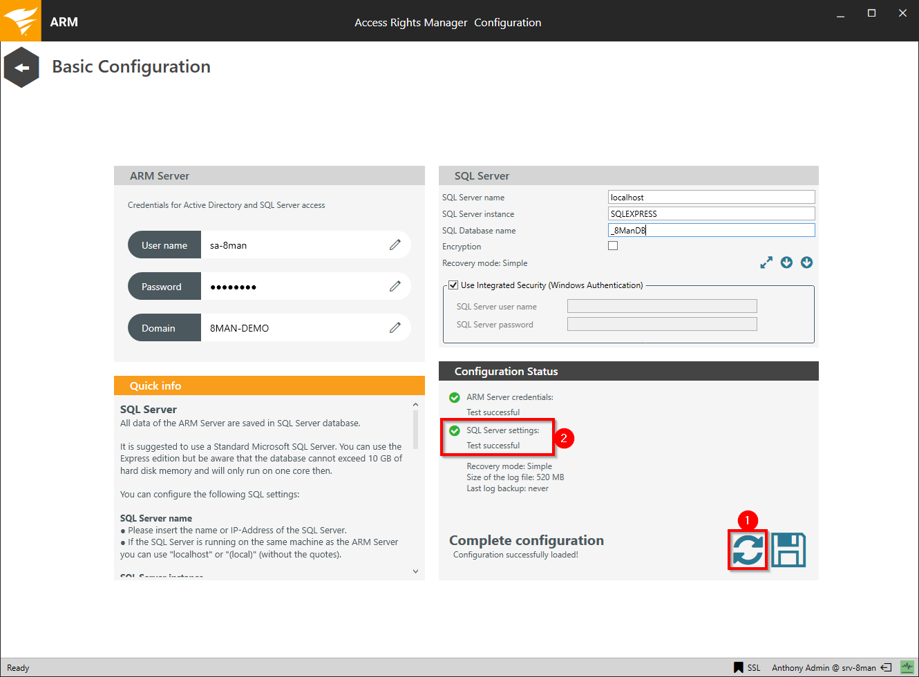 - Click the refresh button to verify the connection to SQL Server running on your SQL database server.