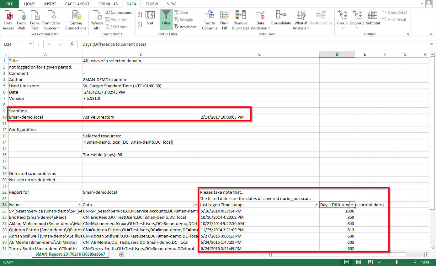 Review the data in the report. If you are using historical scan data, there may be differences in the days since the last login.