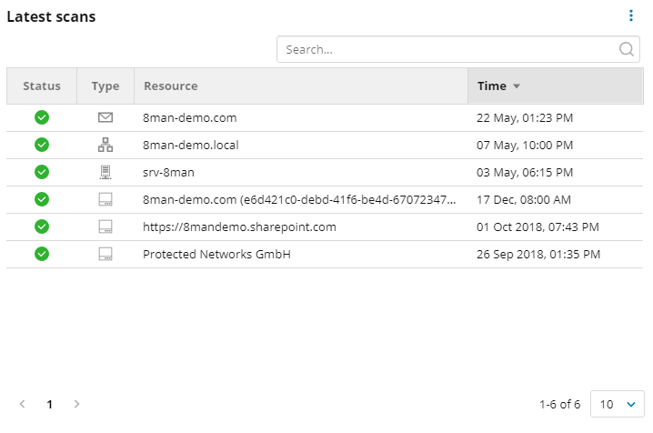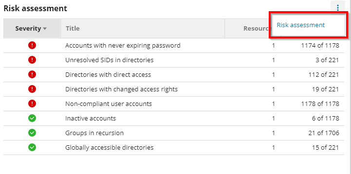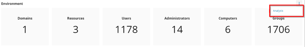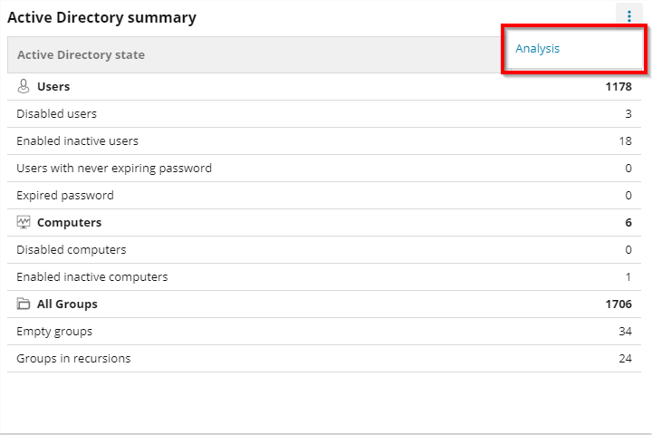 This widget provides a summary of your Active Directory. Click the ellipsis  icon and select Analysis to view the Active Directory Analyze scenarios.