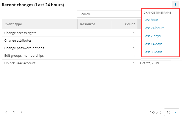 This widget provides an overview of the latest changes in your ARM deployment. You can enter an event name in the search box to locate events of special interest or click the ellipsis  icon to display the widget menu and set the change time frame.