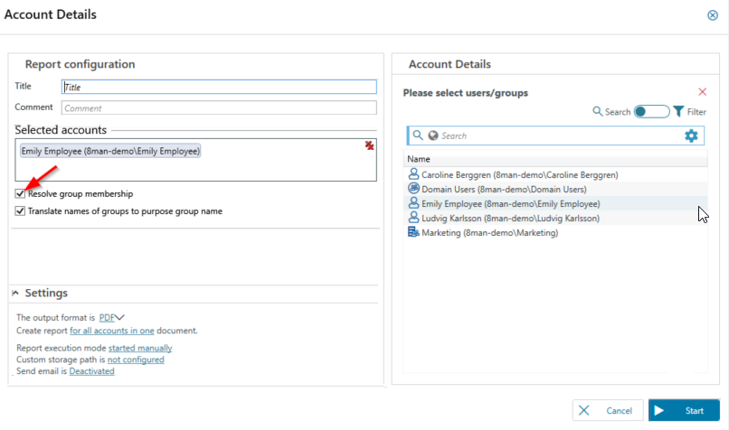 In the Selected accounts box, select the Resolve group memberships checkbox to get the memberships listed and resolved in the report.