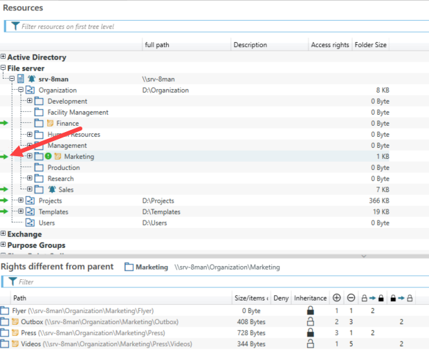 In the Resources screen, the green arrow indicates that some sub-directories contain divergent access rights.