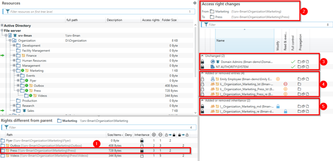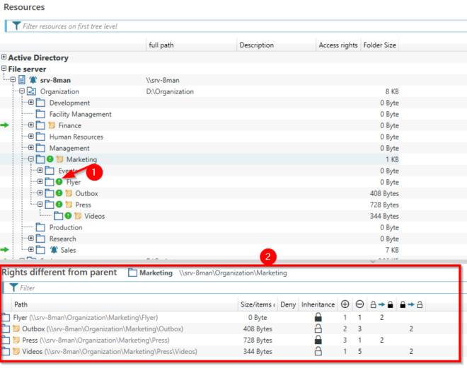 When you select a subdirectory (1), the Resources screen displays the compared directories (2). The screen displays all access rights equal to the parent directory (3) and displays all deviating access rights (4). A plus (+) signifies added access rights while a minus ( - ) signifies removed access rights.
