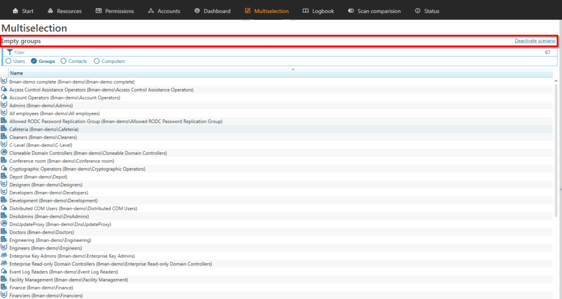 Maximize Groups and double-click Empty groups.   The Multiselection tab is selected automatically. In the Multiselection screen, the Empty groups scenario is active. All listed groups are empty.