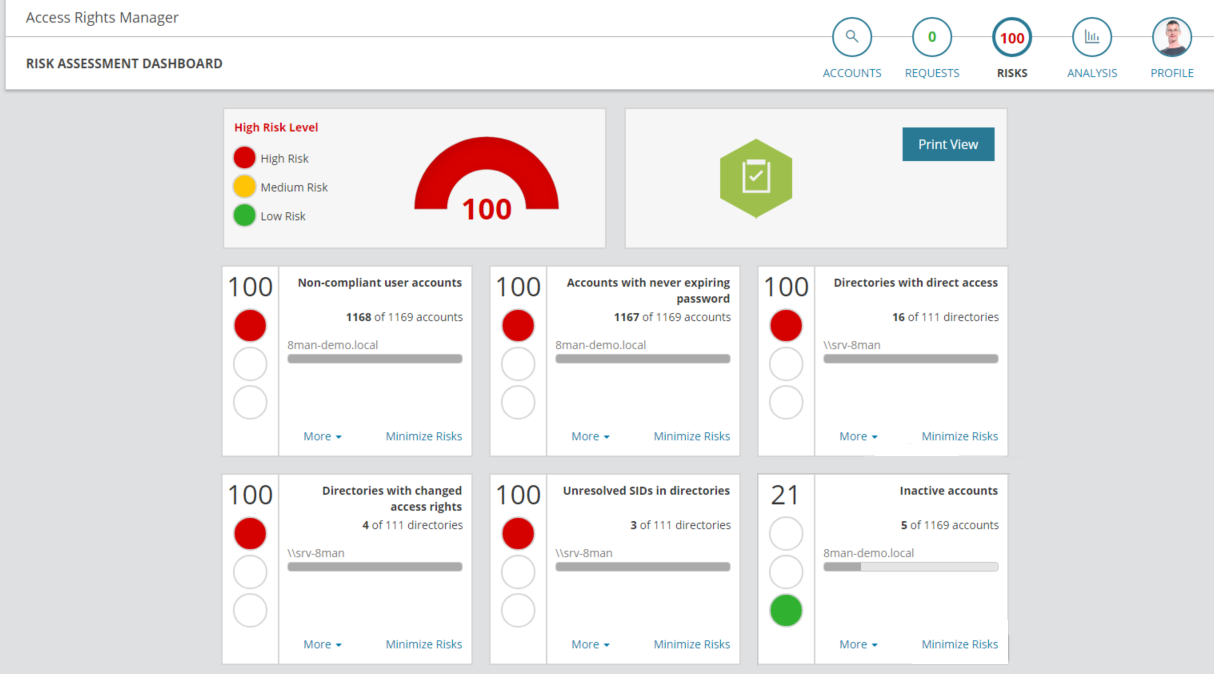 The Risk Analysis dashboard is displayed. All tiles are sorted by risk level.